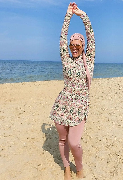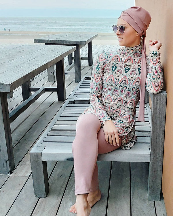 The Bahamas modest swimwear is a suitcase-worthy 3 piece that gives you optimal coverage for any sun-filled adventure. Made with an exclusive print and eco-friendly fabric, this modest swimwear combines comfort with modern style with matching beautiful turban and slim-fit swim tights in blush color.