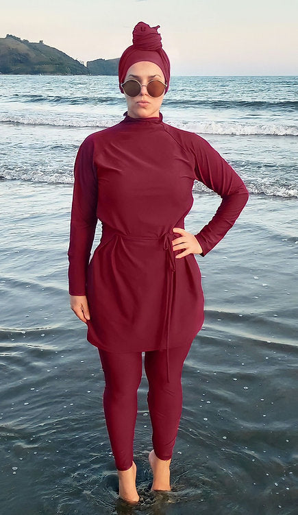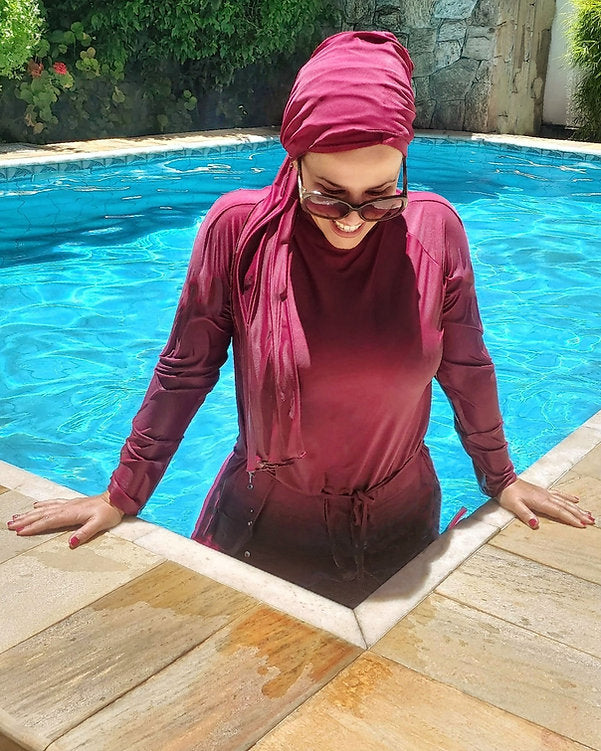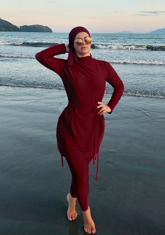 The TANGER CHERRY modest swimsuit expresses the harmony between minimalist cut and modern look made with playful drawstring-waist allowing to wear the dress as you wish. Tight fit or loose fit.