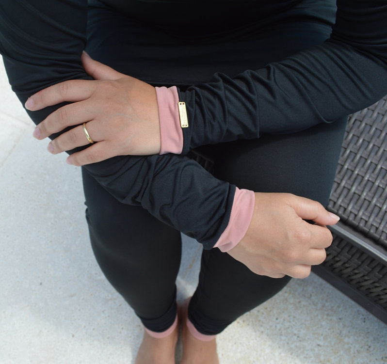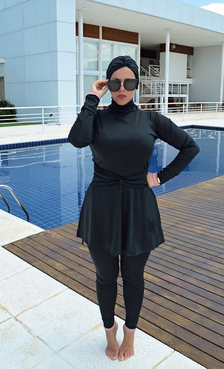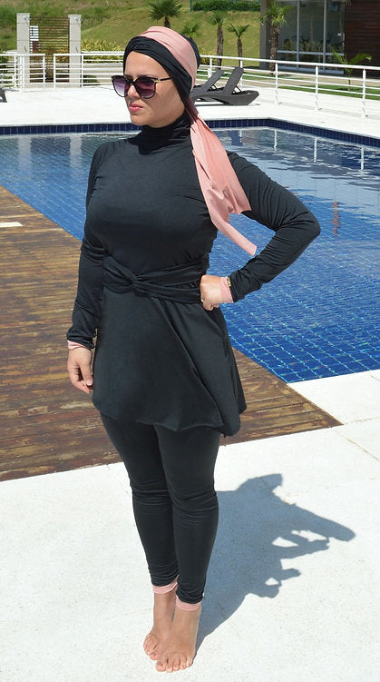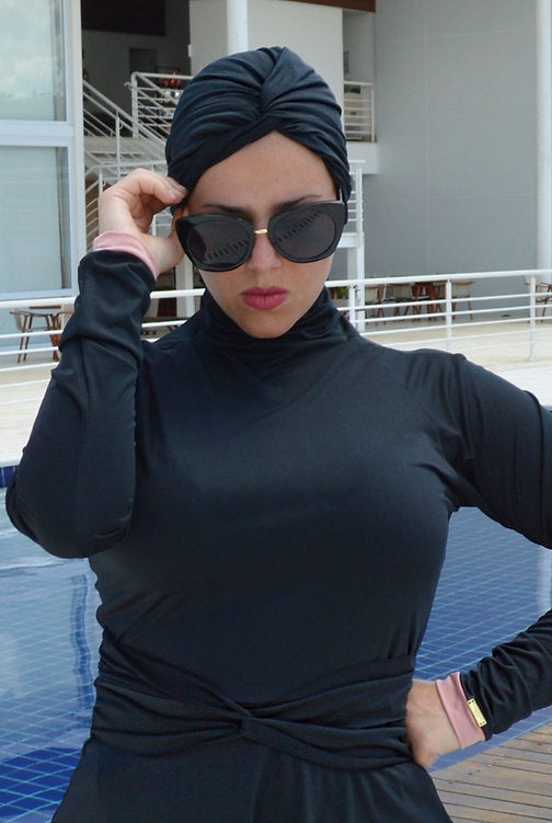 The Tulum Noir modest swimwear combines comfort with modern style. Elegant twisted turban combines with separate blush scarf, skinny pants and swim dress in solid black with delicate details in blush.